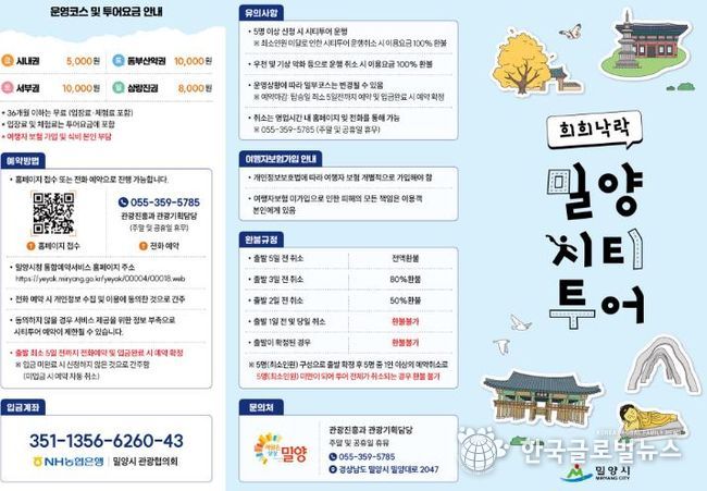 (한국글로벌뉴스 - 김정현 기자) 경남 밀양시는 오는 12일부터 11월 30일까지 매주 금요일부터 일요일까지 ‘희희낙락 밀양 시티투어'를 운영한다고 8일 밝혔다.