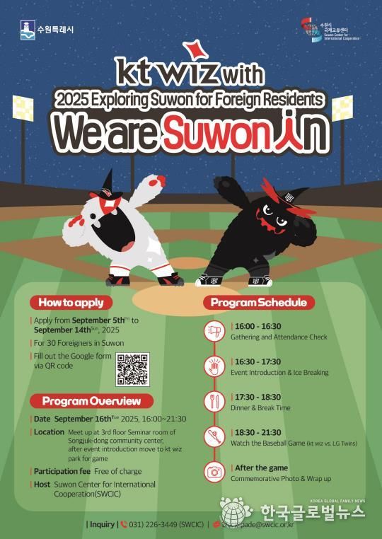 이번 프로그램은 kt위즈와 함께한다. 참가자들은 수원시 대학생 공공외교단과 함께 16일 수원KT위즈파크에서 열리는 kt위즈와 LG트윈스의 경기를 관람하며 한국 야구 응원 문화를 체험한다. 경기 전 음식도 제공한다.