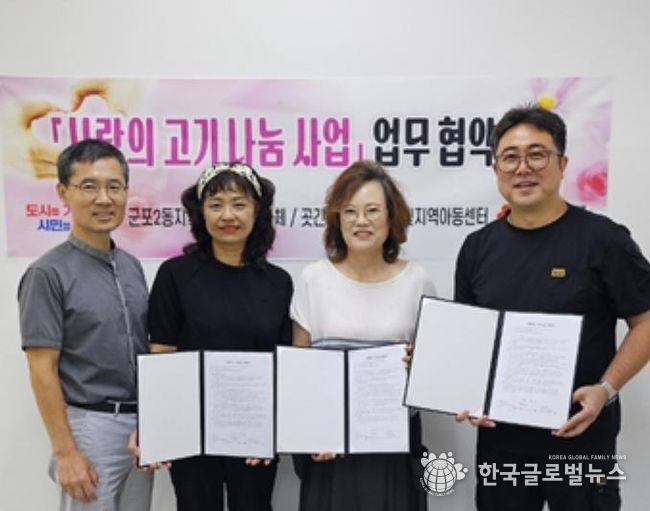 (한국글로벌뉴스 - 박소연 기자) 군포시 군포2동 지역사회보장협의체는 2025년 9월 8일 지역업체 ‘곳간인심’(대표자 박원남) 및 ‘당동큰빛지역아동센터’와 함께 사랑의 고기나눔 협약을 체결했다.
