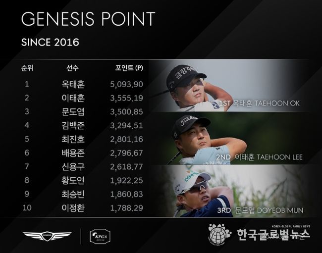 다음 달 23일부터 26일까지는 충남 천안 소재 우정힐스CC에서 KPGA 투어와 DP월드투어 공동주관 대회인 ‘제네시스 챔피언십’이 열린다. ‘제네시스 챔피언십’에는 ‘제네시스 챔피언십’ 직전 대회 종료 기준 제네시스 포인트 상위 36명의 선수가 출전 자격을 얻는다.