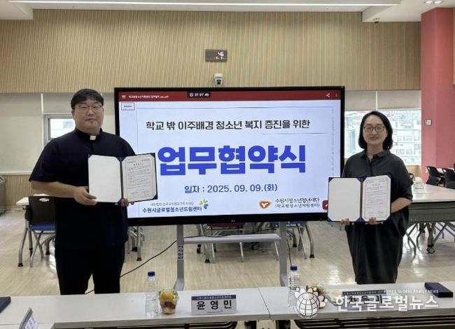 두 기관은 협력 체계를 강화해 학교 밖 이주배경청소년의 안정적인 정착을 돕고, 건강한 성장을 지원하기로 했다. 9일 수원시글로벌청소년드림센터에서 열린 협약식에는 양 기관 센터장과 관계자가 함께했다.