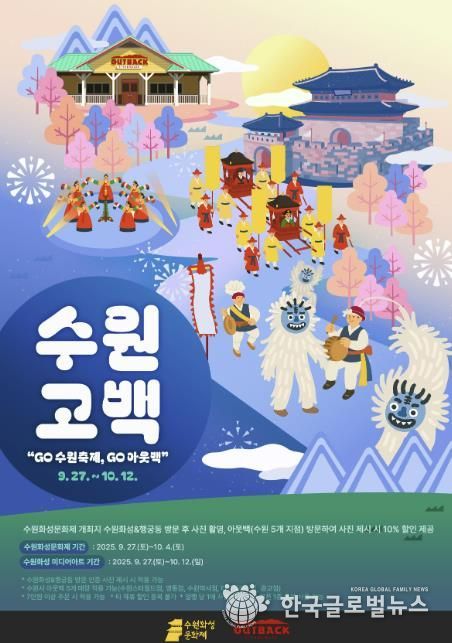 (한국글로벌뉴스 - 박소연 기자) 수원시는 수원화성과 행궁동을 찾은 방문객을 대상으로 아웃백스테이크하우스 할인 이벤트 ‘GO 수원축제, GO 아웃백’를 연다.
