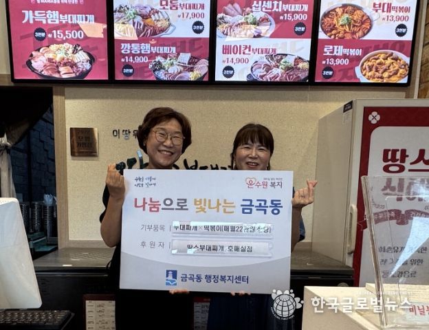 (한국글로벌뉴스 - 박소연 기자) 수원시 권선구 금곡동 행정복지센터는 지난 18일, 관내 '땅스부대찌개' 호매실점과 함께 “이웃돕기 나눔 전달식”을 진행했다고 밝혔다.