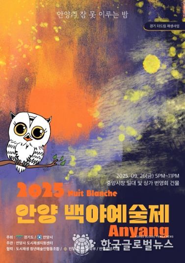 (한국글로벌뉴스 - 박소연 기자) 안양시는 이달 26일 오후 5시부터 11시까지 만안구 안양4동 안양중앙시장에서 청년들이 즐길 수 있는 ‘안양 백야예술제(Nuit Blanche Anyang)’를 개최한다고 19일 밝혔다.