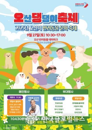 (한국글로벌뉴스 - 박소연 기자) 오산시는 오는 27일 오산 반려동물테마파크(오산천로 72)에서 ‘2025 오산 댕댕이 축제’를 개최한다. 시는 이번 축제를 통해 반려동물 복지와 교감 문화를 확산하고, 오산을 반려친화도시로 자리매김하겠다는 구상이다.