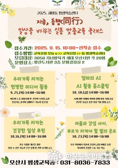 (한국글로벌뉴스 - 박소연 기자) 오산시는 9월 23일부터 10월 24일까지 양산도서관, 소리울도서관, 남촌동 행복온커뮤니티센터에서 ‘지금, 동행(同行) – 일상을 바꾸는 실용 맞춤교육 클래스’를 운영한다고 밝혔다.