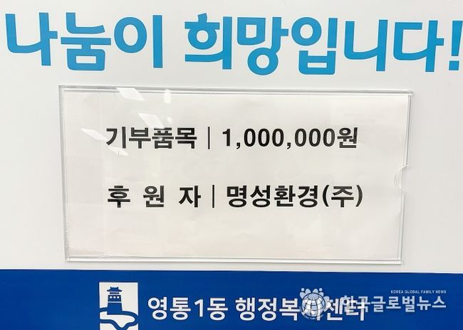(한국글로벌뉴스 - 박소연 기자) 지난 17일, 명성환경(주)은 추석 명절을 맞이하여 어려운 이웃에게 전달해 달라며 성금 100만원을 경기사회복지공동모금회를 통해 영통1동에 기탁했다.