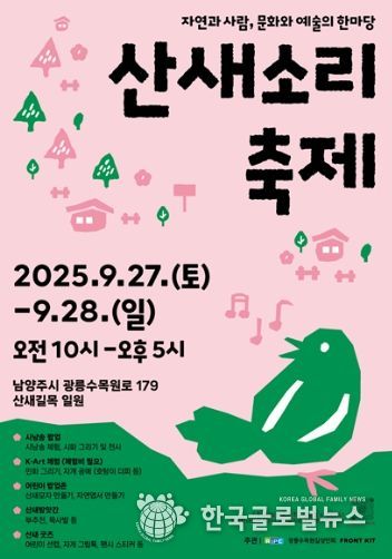 (한국글로벌뉴스 - 박소연 기자) 남양주시 진접읍 광릉숲 인근 산새길목 일원에서 오는 27일부터 28일까지 “산새소리 축제”가 열린다.
