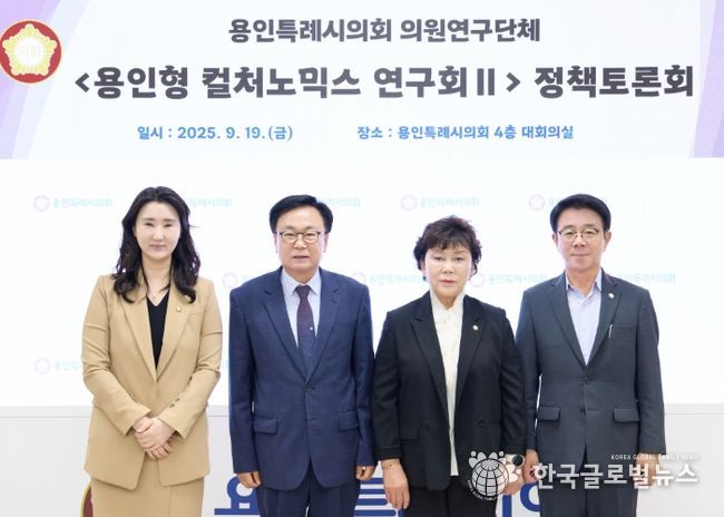 (한국글로벌뉴스 - 박소연 기자) 용인특례시의회 의원연구단체 ‘용인형 컬처노믹스 연구회Ⅱ’가 19일 의회 대회의실에서 ‘용인시 문화관광산업 육성을 위한 컬처노믹스 전략 수립’ 연구용역과 관련해 정책토론회를 개최했다.