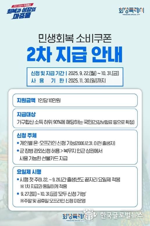 (한국글로벌뉴스 - 박소연 기자) 화성특례시가 민생회복 소비쿠폰 1차 지급률 99.2%로 전국 특례시 중 1위를 달성한 데 이어, 22일부터 2차 지급으로 민생회복 가속에 나섰다.