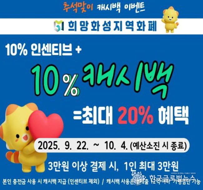 (한국글로벌뉴스 - 박소연 기자) 화성특례시가 추석 명절을 맞아 9월 22일부터 10월 4일까지 ‘희망화성지역화폐 특별 캐시백 이벤트’를 운영한다.
