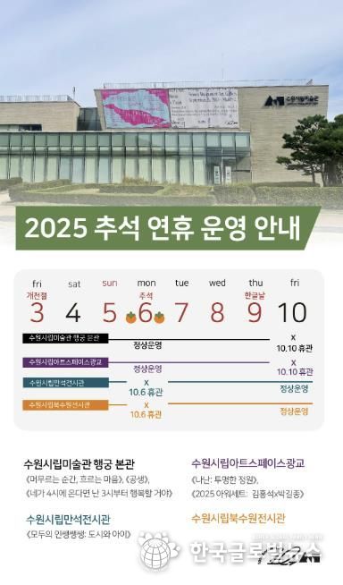 수원시립미술관 행궁 본관은 개천절인 10월 3일(금)부터 추석 연휴와 한글날인 10월 9일(목)까지 휴관 없이 정상 개관하며 추석 당일인 10월 6일(수)에는 무료 관람을 실시하며, 10월 10일(금)에 대체 휴관한다.