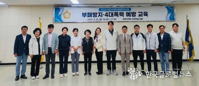 (한국글로벌뉴스 - 박소연 기자) 안양시의회는 지난 22일 시의회 소회의실에서 시의원과 사무국 직원을 대상으로 ‘부패방지 및 4대폭력 예방 교육’을 진행했다. 이번 교육은 법정의무교육으로, 청렴 의식 함양과 4대폭력(성희롱, 성폭력, 성매매, 가정폭력)에 대한 예방 의식 고취를 위해 마련됐다.