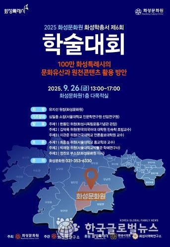 (한국글로벌뉴스 - 박소연 기자) 화성특례시는 오는 9월 26일 오후 1시부터 5시까지 화성문화원 1층 다목적실에서 ‘화성학총서 제6회 학술대회’가 열린다고 밝혔다. 이번 학술대회는 화성문화원이 주최하고, 화성학연구소가 주관하며, 화성특례시와 화성특례시의회, 화성지역학연구소가 후원한다.
