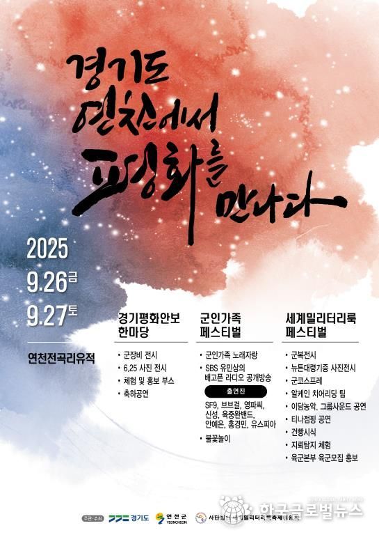 (한국글로벌뉴스 - 박소연 기자) 경기도는 9월 26일과 27일 이틀간 연천군 전곡리유적에서 ‘2025년 경기 평화안보 한마당’을 개최한다. ‘연천 군인가족 페스티벌’과 함께 진행될 예정인 이날 행사는 도민과 군인가족이 함께 평화와 안보의 가치를 공유하는 소통과 화합의 장으로 마련했다.