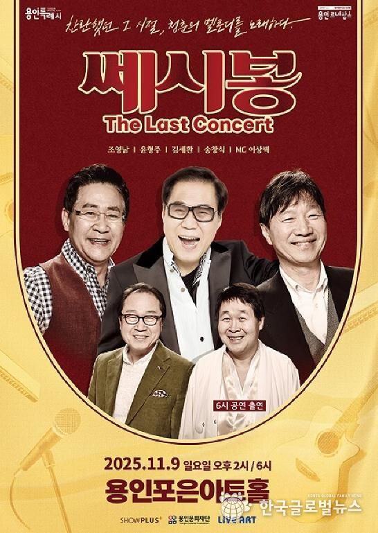 (한국글로벌뉴스 - 박소연 기자) 용인문화재단은 오는 11월 9일 용인포은아트홀에서 ‘2025 쎄시봉 [The Last] 콘서트 – 용인’을 개최한다. 공연은 단 하루 오후 2시와 6시, 2회 진행된다.