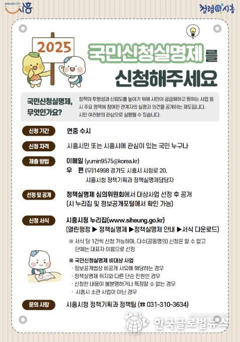 (한국글로벌뉴스 - 박소연 기자) 시흥시는 정책의 투명성과 책임성을 강화하기 위해 2025년도 정책 실명제를 시행하고, 아울러 이의 일환으로 국민 수요를 반영한 ‘국민신청실명제’를 상시 운영한다.