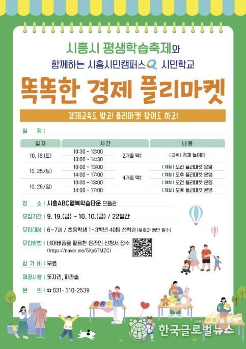 (한국글로벌뉴스 - 박소연 기자) 시흥시는 제17회 시흥시평생학습축제(10월 24일~26일)와 연계해 어린이들의 경제활동 이해 증진과 가족 간 소통 강화를 위한 ‘똑똑한 경제 플리마켓’을 오는 10월 18일부터 시흥ABC행복학습타운 으뜸관에서 추진한다.