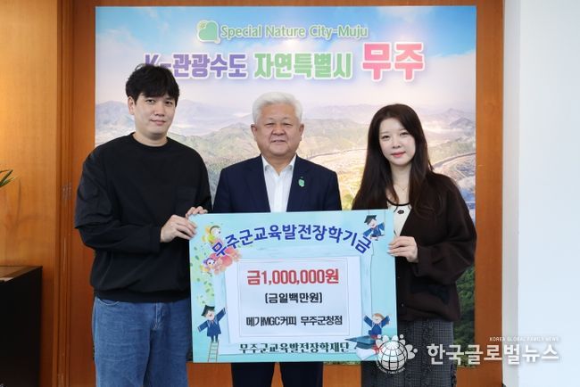 (한국글로벌뉴스 - 박소연 기자) 메가MGC커피 무주군청점에서 지난 23일 (재)무주군교육발전장학재단(이사장 황인홍 무주군수)에 장학금 1백만 원을 기탁했다.