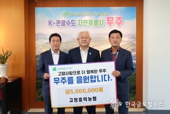 (한국글로벌뉴스 - 박소연 기자) 전북특별자치도 고창흥덕농협 임직원들이 지난 23일 무주군에 고향사랑 기부금 5백만 원을 기탁했다.