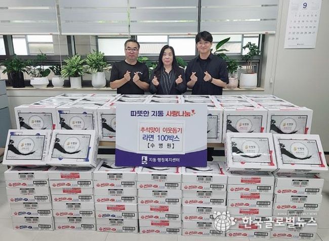 (한국글로벌뉴스 - 박소연 기자) 지난 22일, 수원시 팔달구 지동 소재 수병원은 추석 명절을 맞아 지역사회 취약계층을 위해 라면(20개입) 100박스를 지동 행정복지센터에 전달했다.