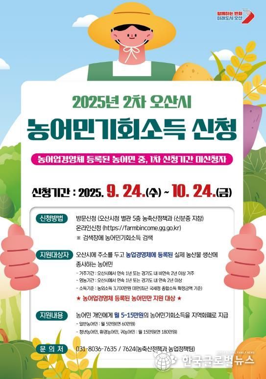 (한국글로벌뉴스 - 박소연 기자) 오산시는 농업‧농촌의 공익적 가치를 보장하기 위한 ‘2025년 농어민 기회소득’ 2차 신청·접수를 오는 9월 24일부터 10월 24일까지 진행한다고 밝혔다.