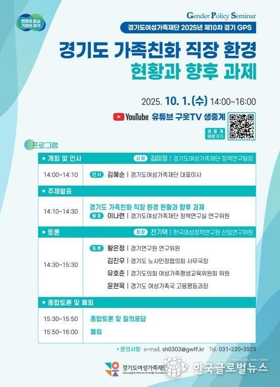 (한국글로벌뉴스 - 박소연 기자) 경기도여성가족재단이 10월 1일 오후 2시 ‘경기도 가족친화 직장환경 현황과 향후 과제’를 주제로 정책토론회를 개최한다.