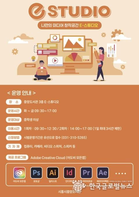 (한국글로벌뉴스 - 박소연 기자) 시흥시중앙도서관은 시민들의 미디어 창작활동을 적극 지원하기 위해 도서관 3층에 위치한 e-스튜디오에 어도비 크리에이티브 클라우드(Adobe Creative Cloud)를 도입해 오는 9월 25일부터 시범 운영을 시작한다.
