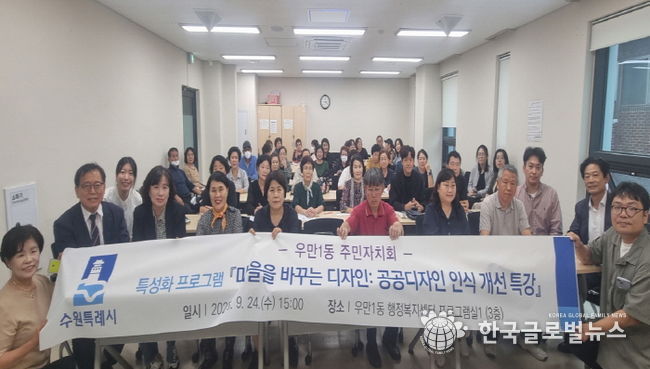 (한국글로벌뉴스 - 박소연 기자) 수원시 팔달구 우만1동 주민자치회는 지난 24일 우만1동 행정복지센터에서 특성화 프로그램의 일환으로 '마을을 바꾸는 디자인: 공공디자인 인식 개선 특강'을 진행했다.