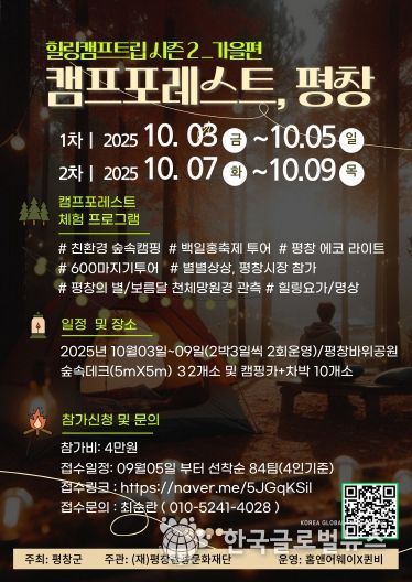 (한국글로벌뉴스 - 김정현 기자) 평창관광문화재단은 바위공원 힐링 프로그램 운영 사업을 통해 가을철 자연 속 힐링과 체험을 결합한 가족 단위 캠프 프로그램, '캠프포레스트, 평창'의 참가자를 모집한다. 행사는 오는 10월 3일부터 9일까지 평창군 평창읍 바위공원 일대에서 진행된다.