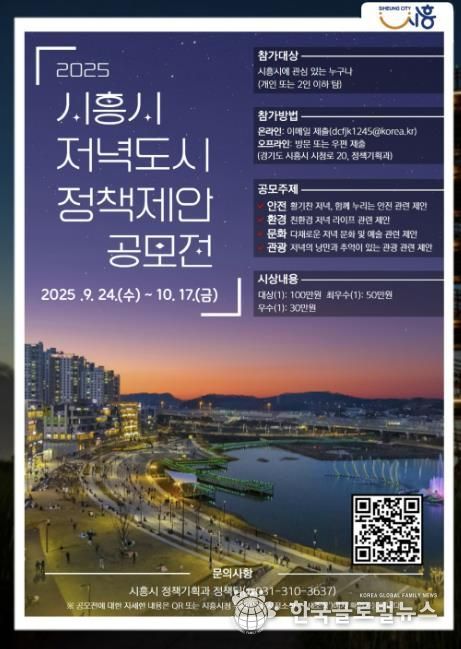 (한국글로벌뉴스 - 박소연 기자) 시흥시는 시민이 살고 싶은 저녁과 쉼이 있는 행복한 도시 시흥의 모습을 시민과 함께 구상하고 정책에 반영하고자 ‘2025년 시흥시 저녁도시 정책제안 공모전’을 진행한다.