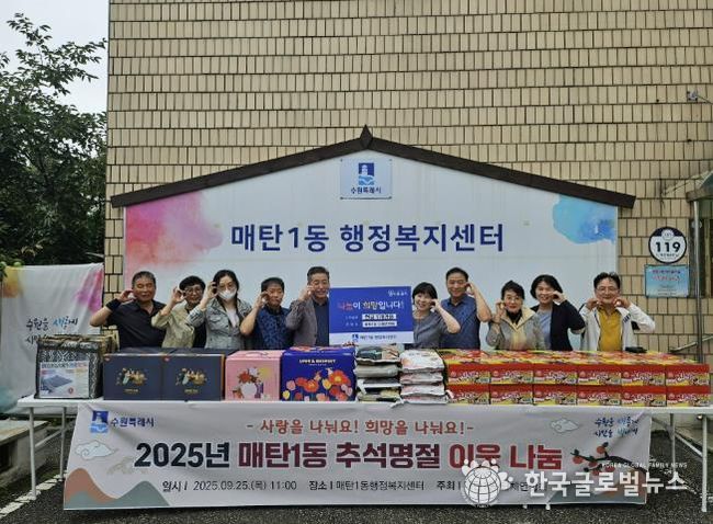(한국글로벌뉴스 - 박소연 기자) 25일 수원특례시 영통구 매탄1동은 추석 명절을 맞이하여 관내 저소득층 300여 세대에 후원물품을 전달하는 이웃돕기 나눔 전달식을 개최했다.