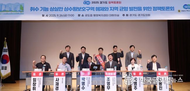(한국글로벌뉴스 - 박소연 기자) 경기도의회 도시환경위원회 박명수 의원(국민의힘, 안성2)이 좌장을 맡은 '취수 기능을 상실한 상수원보호구역 해제와 지역 균형 발전을 위한 정책토론회'가 26일 오전 11시, 공도읍 행정복지센터 대회의실에서 열렸다. 이번 토론회는 ‘2025 정책토론 대축제’의 일환으로 박명수 의원이 기획하고 경기도의회와 경기도가 공동으로 주최했다.