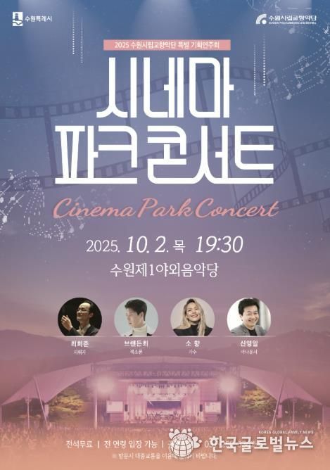 (한국글로벌뉴스 - 박소연 기자) 수원특례시는 10월 2일 오후 7시 30분 수원제1야외음악당에서 ‘시네마 파크 콘서트’를 연다.