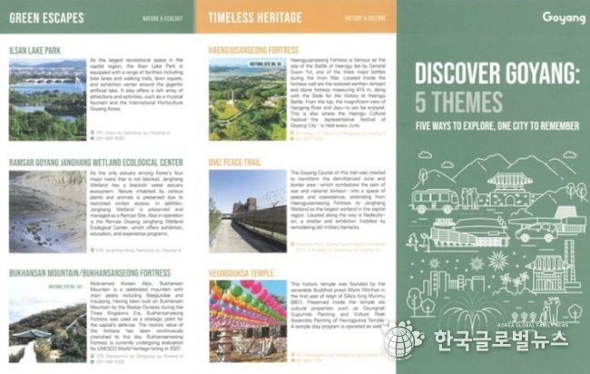 새로 발간된 관광홍보 안내지 제목은 ‘DISCOVER GOYANG: 5 THEMES’ 으로 자연·생태(Green Escapes), 역사·문화(Timeless Heritage) 등 5개의 테마로 분류해 관광지를 소개한다. 특히 방문객의 관심사와 취향에 맞춰 맞춤형 여행코스를 선택할 수 있도록 구성된 것이 특징이다.