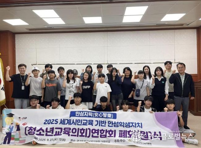 (한국글로벌뉴스 - 박소연 기자) 경기도안성교육지원청은 2025년 9월 27일 오후 1시, 교육지원청 별관 대회의실에서“안성의 빛나는 리더들”을 주제로 2025 안성학생자치(청소년교육의회)연합회 폐회(원)식을 성황리에 개최했다.