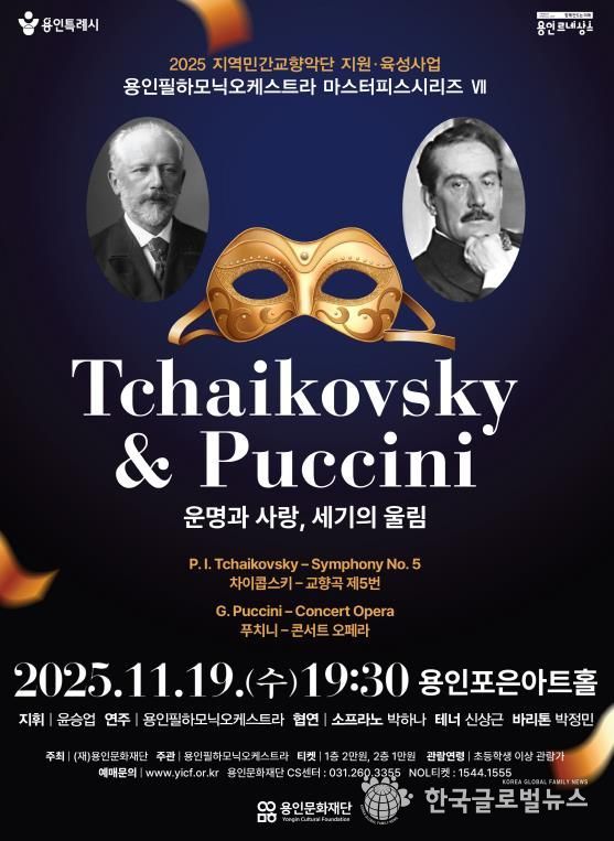 (한국글로벌뉴스 - 박소연 기자) 용인문화재단은 오는 11월 19일 오후 7시 30분, 용인포은아트홀에서 용인필하모닉오케스트라(지휘 윤승업) ‘Tchaikovsky · Puccini '운명과 사랑, 세기의 울림'’ 공연을 개최한다고 밝혔다.