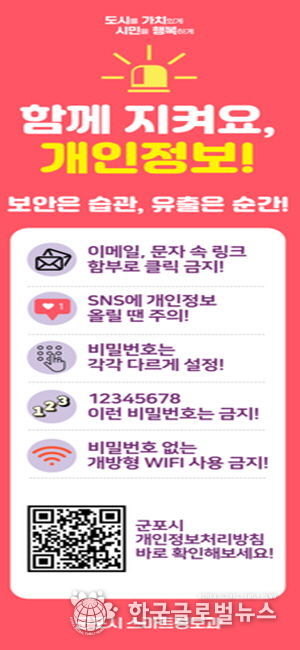 (한국글로벌뉴스 - 박소연 기자) 군포시는 9월 30일 ‘개인정보 보호의 날’을 맞아 시민들의 개인정보 보호 인식을 높이고 생활 속 보호 문화를 확산하기 위해 ‘2025년 개인정보 보호의 날 기념 캠페인’을 9월 24일부터 10월 2일까지 추진한다.