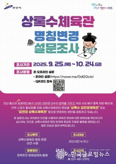 (한국글로벌뉴스 - 박소연 기자) 안산시는 내달 24일까지 ‘상록수체육관’ 명칭 변경 설문조사를 실시한다고 30일 밝혔다.