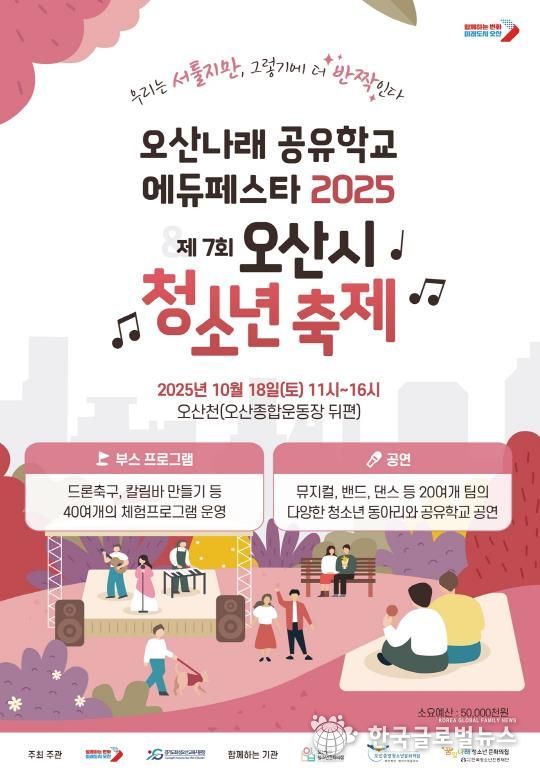 (한국글로벌뉴스 - 박소연 기자) 오산시는 오는 10월 18일 오전 11시부터 오후 4시까지, 오산종합운동장 뒤편 오산천 잔디밭에서 화성오산교육지원청과 공동으로 ‘오산나래공유학교 에듀페스타 2025 · 제7회 오산시 청소년 축제’를 개최한다고 밝혔다.