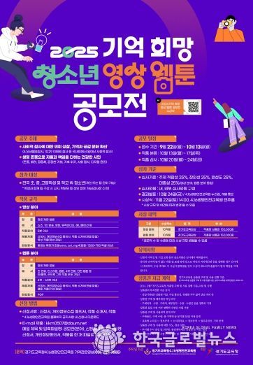 (한국글로벌뉴스 - 박소연 기자) 경기도교육청4.16생명안전교육원이 ‘2025 기억 희망 청소년 영상‧웹툰 공모전’을 개최한다.