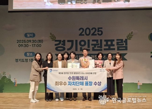 (한국글로벌뉴스 - 박소연 기자) 수원특례시가 제3회 경기도 인권행정 추진 우수 자치단체 평가에서 최우수상으로 선정되며 3년 연속 최우수상을 받는 성과를 거뒀다. 시상식은 9월 30일 경기도청 다산홀에서 열렸다.
