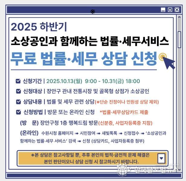 (한국글로벌뉴스 - 박소연 기자) 수원시 장안구는 오는 10월 13일부터 법률·세무 상담을 받기 어려운 관내 전통시장 및 골목형 상점가 소상공인을 대상으로 쉽고 편리하게 상의할 수 있는 무료 상담인 ‘소상공인과 함께하는 법률·세무 서비스’ 사업을 운영한다.