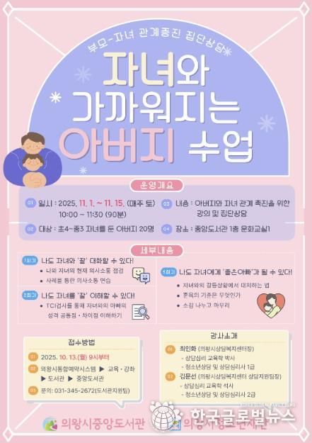 (한국글로벌뉴스 - 박소연 기자) 의왕시 중앙도서관은 사춘기 자녀와의 관계에서 어려움을 겪고 있는 아버지를 위한 부모 집단상담 프로그램 ‘자녀와 가까워지는 아버지 수업’을 운영한다.