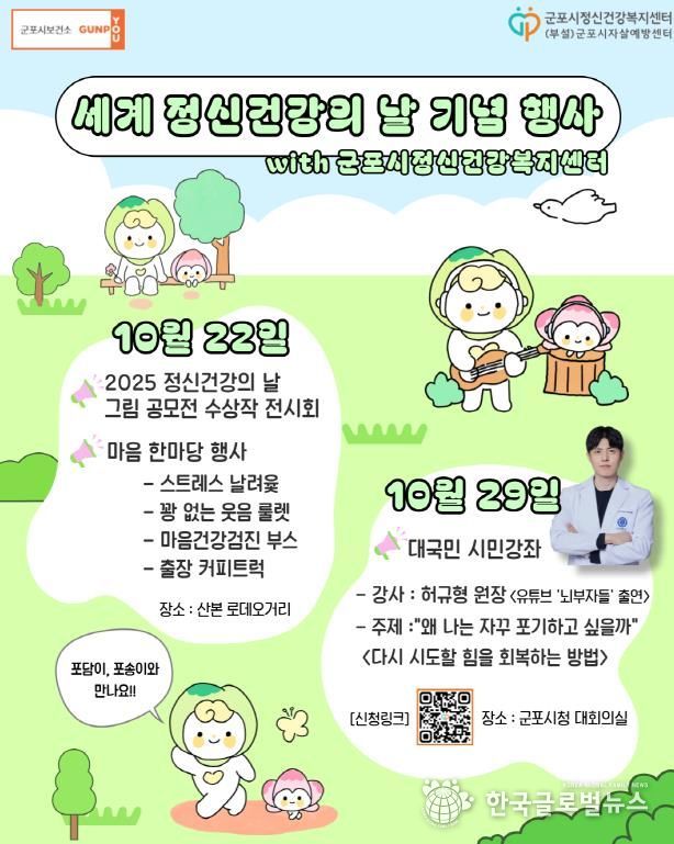 (한국글로벌뉴스 - 박소연 기자) 군포시정신건강복지센터 부설 군포시자살예방센터는 오는 10월 10일 세계 정신건강의 날을 맞이해 정신건강을 위한 다양한 행사를 개최할 예정이다.