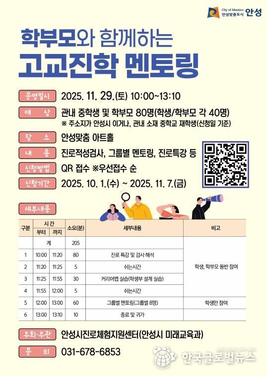 (한국글로벌뉴스 - 박소연 기자) 안성시는 오는 11월 29일 오전 10시, 안성맞춤 아트홀에서 관내 중학생과 학부모를 대상으로 ‘학부모와 함께하는 고교진학 멘토링’을 실시한다고 밝혔다.