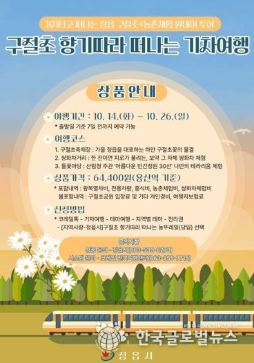 (한국글로벌뉴스 - 김정현 기자) 정읍시농업기술센터가 가을 여행철을 맞아 구절초 꽃축제와 농촌체험을 엮은 기차여행 상품 ‘농뚜레일 투어’ 참가자를 오는 19일까지 모집한다.