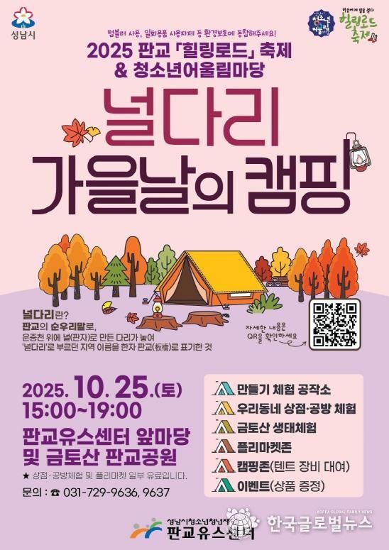 (한국글로벌뉴스 - 박소연 기자) 성남시청소년청년재단 판교유스센터는 10월 25일, 오후 3시부터 7시에 판교유스센터 앞마당 및 판교공원에서 ‘판교 힐링로드 축제와 청소년어울림마당’ 을 개최한다.