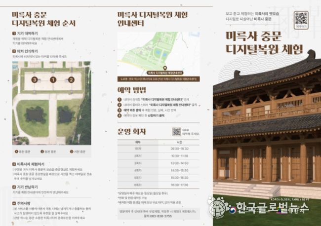 미륵사 중문 디지털 복원 체험은 매주 화요일부터 일요일(월요일 휴무)까지 1일 6회 무료로 운영되며, 회차당 30명씩 참여할 수 있다. 현장 접수(회차당 5명) 또는 네이버에 ‘미륵사 디지털 복원 체험 안내센터’ 검색 후 예약 누리집(회차당 25명)에서 온라인 예약 가능하다.