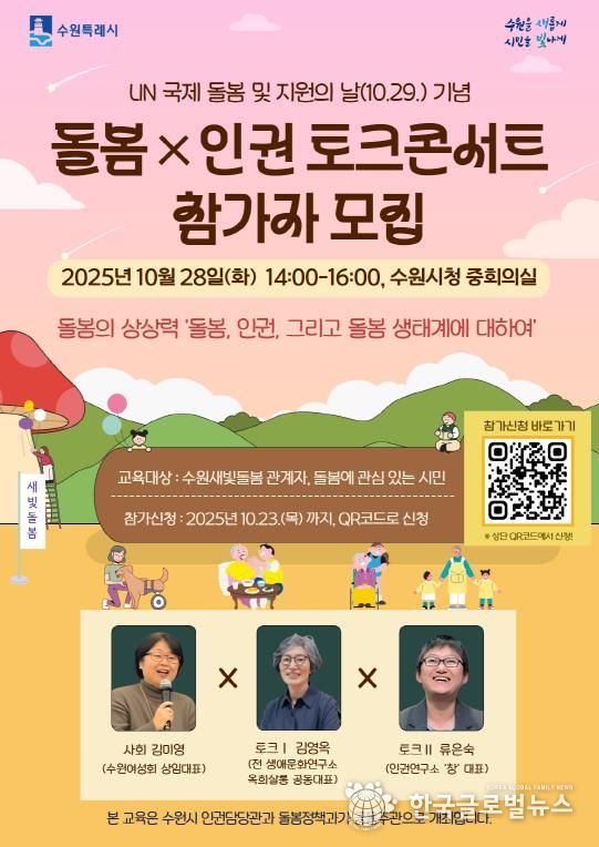 (한국글로벌뉴스 - 박소연 기자) 수원특례시가 ‘UN(유럽연합) 국제 돌봄 및 지원의 날(10월 29일)’을 기념해 28일 오후 2시 수원시청 별관 1층 중회의실에서 ‘2025년 돌봄×인권 토크콘서트’를 연다.